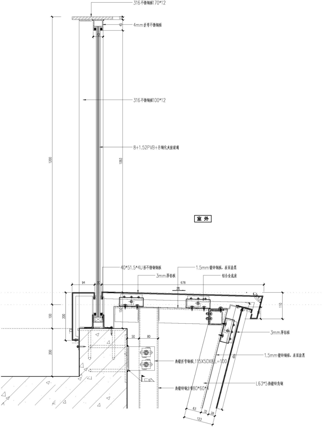 雨蓬部分选用3mm喷砂不锈钢板材质